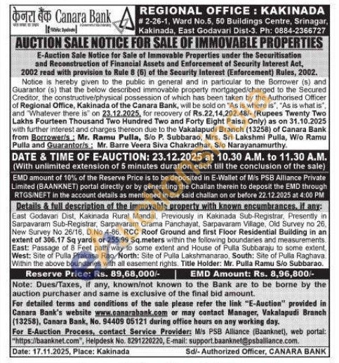 East Godavan Dist, Kakinada Rural Mandal, Previously in Kakinada Sub-Registrar, Presently in Sarpavaram Sub-Registrar, Sarpavaram Grama Panchayat, Sarpavaram Village, Old Survey no 26, New Survey No 26/16, D.No 4-66, RCC Roof Ground and first Floor Residential Building in an extent of 306.17 Sq yards or 255.99 Sq.meters within the following boundaries and measurements. East: Passage of 8 Feet path way to some extent and House of Pulla Subbaraju to some extent, West: Site of Pulla Prakasa Rao, North: Site of Pulla Lakshmanarao, South: Site of Pulla Raghava Within the above boundaries with all easement rights. Title Holder: Mr. Pulla Ramu Sio Subbarao.