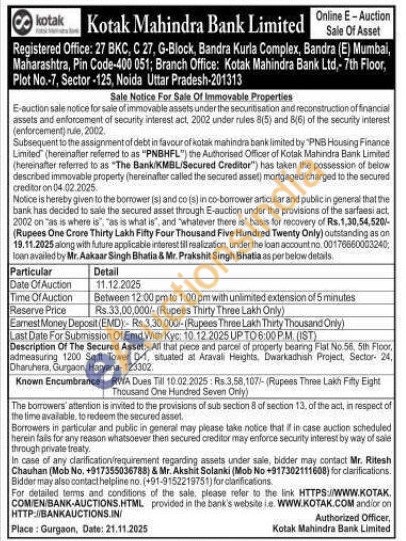 Description Of The Secured Asset:- All that piece and parcel of property bearing Flat No 56, 5th Floor, admeasuring 1200 Sq.ft Tower D-1, situated at Aravali Heights, Dwarkadhish Project, Sector 24, Dharuhera, Gurgaon, Haryana-123302