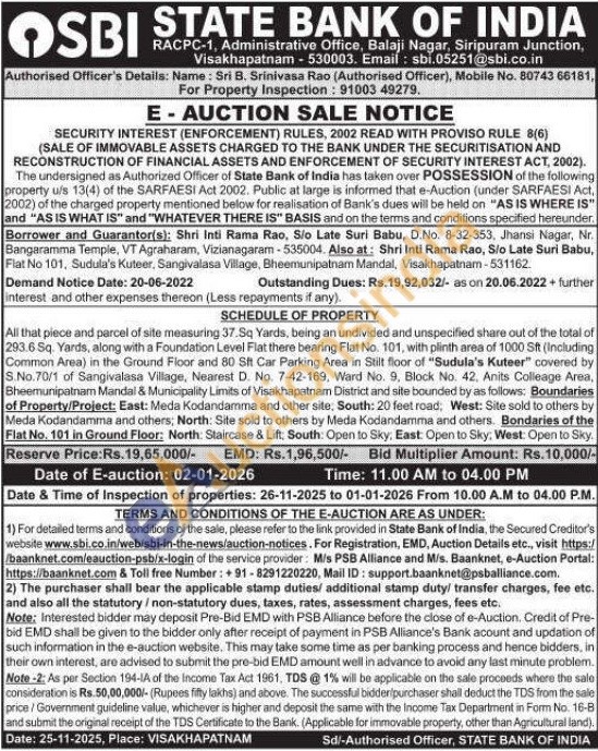 SCHEDULE OF PROPERTY : All that piece and parcel of site measuring 37.Sq Yards, being an undivided and unspecified share out of the total of 293.6 Sq. Yards, along with a Foundation Level Flat there bearing Flat No. 101, with plinth area of 1000 Sft (Including Common Area) in the Ground Floor and 80 Sft Car Parking Area in Stilt floor of "Sudula's Kuteer" covered by S.No.70/1 of Sangivalasa Village, Nearest D. No. 7-42-169, Ward No. 9, Block No. 42. Anits Colleage Area, Bheemunipatnam Mandal & Municipality Limits of Visakhapatnam District and site bounded by as follows: Boundaries of Property/Project: East: Meda Kodandamma and other site, South: 20 feet road, West: Site sold to others by Meda Kodandamma and others; North: Site sold to others by Meda Kodandamma and others. Bondaries of the Flat No. 101 in Ground Floor: North: Staircase & Lift, South: Open to Sky, East: Open to Sky; West: Open to Sky