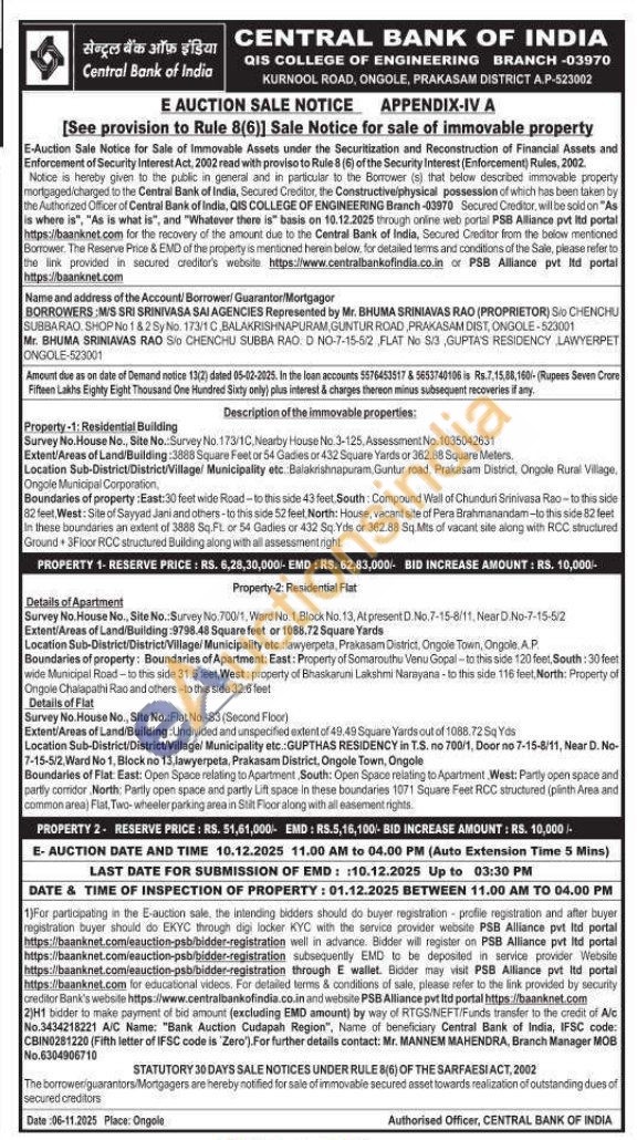 Property-1: Residential Building Survey No.House No., Site No.: Survey No. 173/1C, Nearby House No. 3-125, Assessment No. 1035042631 Extent Areas of Land/Building :3888 Square Feet or 54 Gadies or 432 Square Yards or 382.88 Square Meters Location Sub-District/District/Village/ Municipality etc. Balakrishnapuram, Guntur road, Prakasam District, Ongole Rural Village, Ongole Municipal Corporation, Boundaries of property: East: 30 feet wide Road-to this side 43 feet South Compound Wall of Chunduri Srinivasa Rao-to this side 82 feet, West: Site of Sayyad Jani and others to this side 52 feet North: House, vacant site of Pera Brahmanandam-to this side 82 feet In these boundaries an extent of 3888 Sq. Ft. or 54 Gadies or 432 Sq Yids or 362.88 Sq.Mts of vacant site along with RCC structured Ground + 3Floor RCC structured Building along with all assessment.right