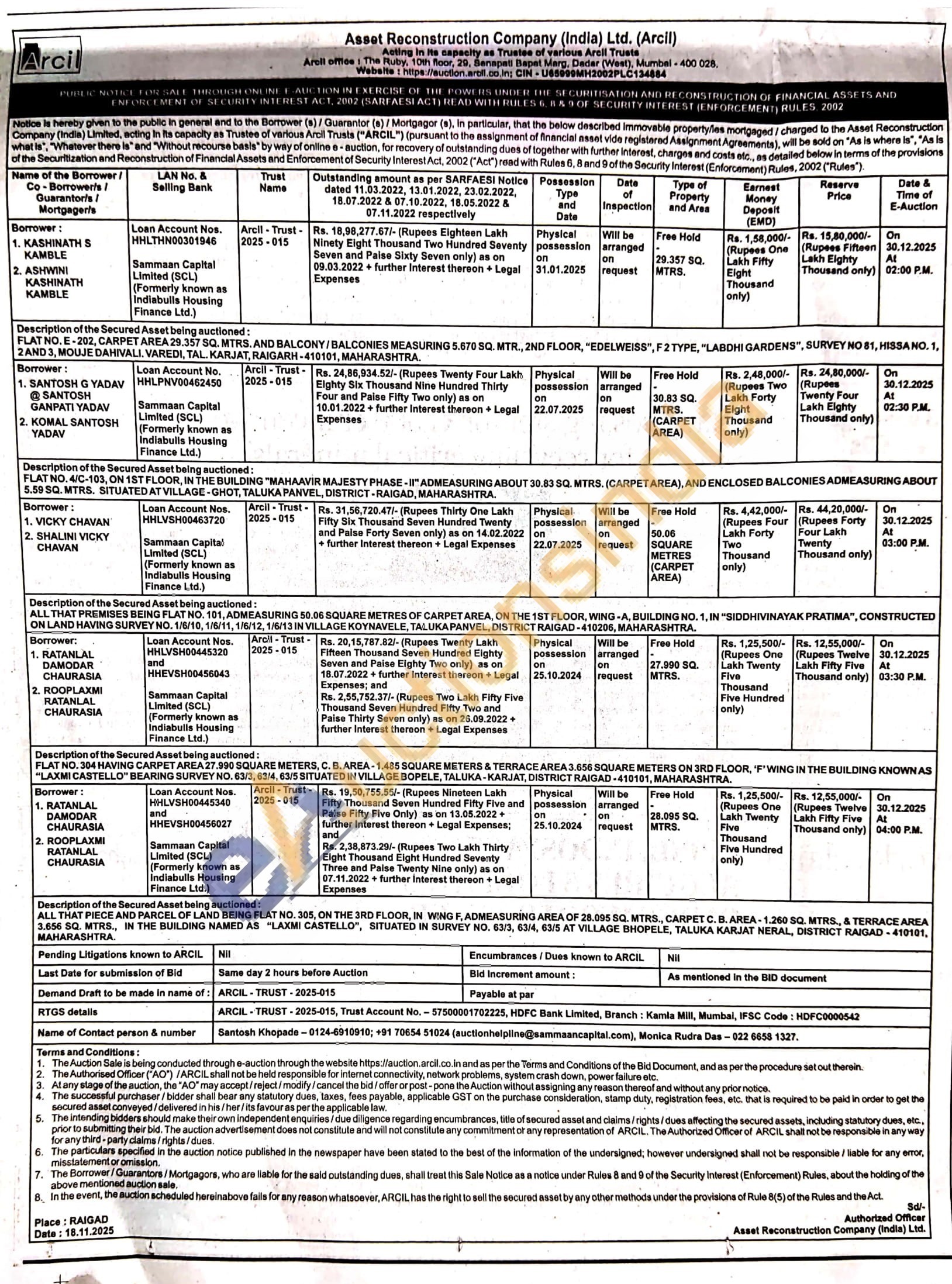 Contact Santosh Khopade-0124-6910910; +91 70654 51024 (auctionhelpline@sammaancapital.com), Monica Rudra Das-022 6658 1327.