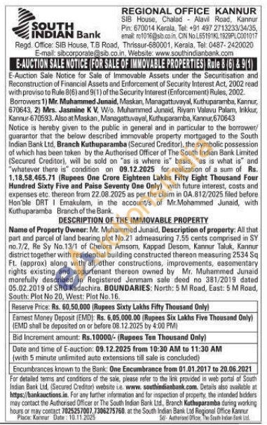 All that part and parcel of land bearing plot No.21 admeasuring 7.55 cents comprised in SY no.7/2, Re Sy No.13/1 of Chelora Amsom, Kappad Desom, Kannur Taluk, Kannur district together with residential building constructed thereon measuring 2534 Sq Ft. (approx) along with all other constructions, improvements, easementary rights existing and appurtenant thereon owned by Mr. Muhammed Junaid marefully described in Registered Jenmam sale deed no 381/2019 dated 05.02.2019 of SRO Kadachira. BOUNDARIES: North: 5 M Road, East: 5 M Road, South: Plot No 20, West: Plot No. 16.
