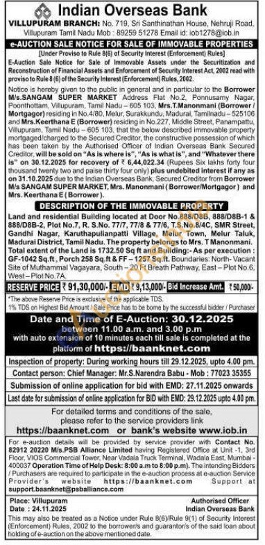 Land and residential Building located at Door No.888/D88, 888/D8B-1 & 888/D8B-2, Plot No.7, R. S.No. 77/7, 77/8 & 77/6, T.S.No.8/4C, SMR Street, Gandhi Nagar, Karuthapulianpatti Village, Melur Town, Melur Taluk, Madurai District, Tamil Nadu. The property belongs to Mrs. T Manonmani. Total extent of the Land is 1732.50 Sq ft and Building:-As per execution: GF-1042 Sq.ft, Porch 258 Sq.ft & FF-1257 Sq.ft. Boundaries: North-Vacant Site of Muthammal Vagayara, South-20 Ft Breath Pathway, East-Plot No.6. West-Plot No.7A