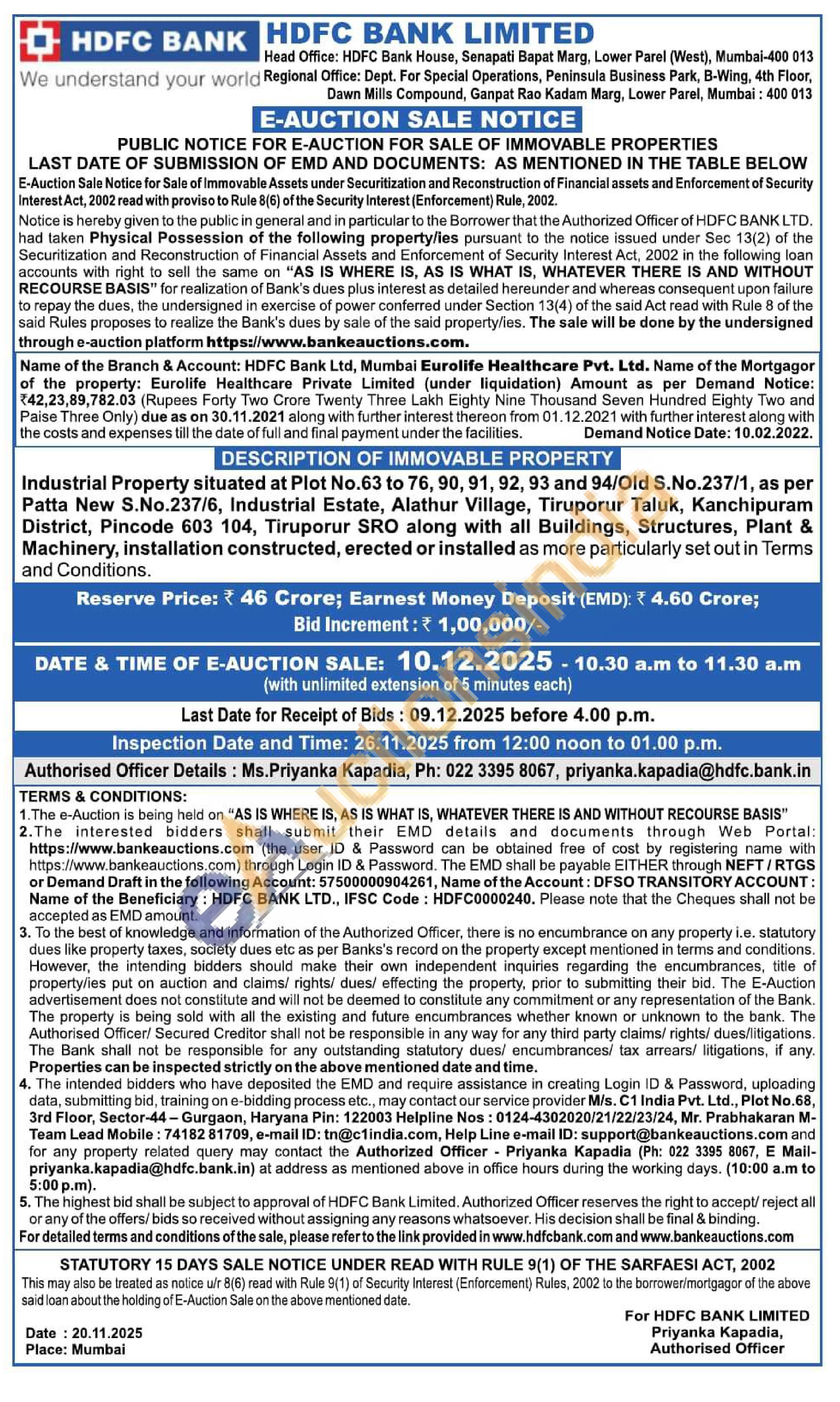 Industrial Property situated at Plot No.63 to 76, 90, 91, 92, 93 and 94/Old S.No.237/1, as per Patta New S.No.237/6, Industrial Estate, Alathur Village, Tiruporur Taluk, Kanchipuram District, Pincode 603 104, Tiruporur SRO along with all Buildings, Structures, Plant & Machinery, installation constructed, erected or installed as more particularly set out in Terms and Conditions.