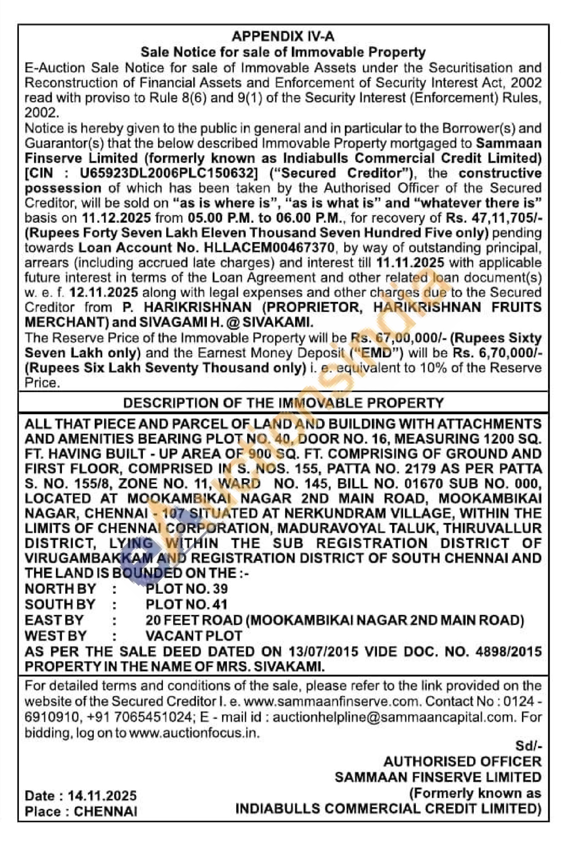 ALL THAT PIECE AND PARCEL OF LAND AND BUILDING WITH ATTACHMENTS AND AMENITIES BEARING PLOT NO. 40, DOOR NO. 16, MEASURING 1200 SQ. FT. HAVING BUILT-UP AREA OF 900 SQ. FT. COMPRISING OF GROUND AND FIRST FLOOR, COMPRISED IN S. NOS. 155, PATTA NO. 2179 AS PER PATTA S. NO. 155/8, ZONE NO. 11, WARD NO. 145, BILL NO. 01670 SUB NO. 000, LOCATED AT MOOKAMBIKAI NAGAR 2ND MAIN ROAD, MΟΟΚΑΜΒΙΚΑΙ NAGAR, CHENNAI - 107 SITUATED AT NERKUNDRAM VILLAGE, WITHIN THE LIMITS OF CHENNAI CORPORATION, MADURAVOYAL TALUK, THIRUVALLUR DISTRICT, LYING WITHIN THE SUB REGISTRATION DISTRICT OF VIRUGAMBAKKAM AND REGISTRATION DISTRICT OF SOUTH CHENNAI