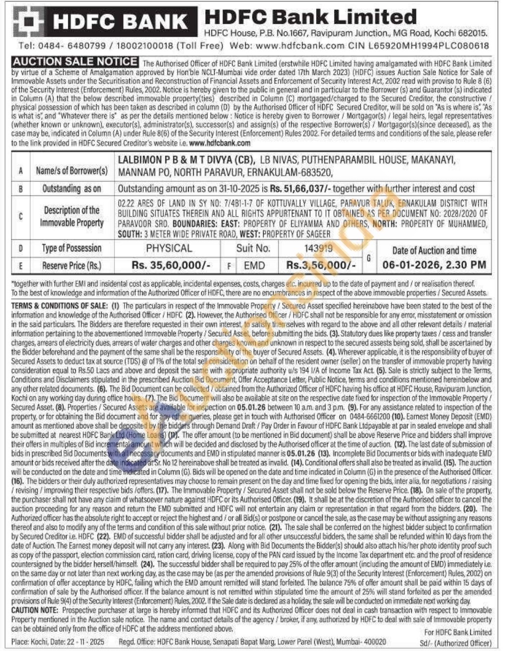 Description of the Immovable Property : 02.22 ARES OF LAND IN SY NO: 7/481-1-7 OF KOTTUVALLY VILLAGE, PARAVUR TALUK, ERNAKULAM DISTRICT WITH BUILDING SITUATES THEREIN AND ALL RIGHTS APPURTENANT TO IT OBTAINED AS PER DOCUMENT NO: 2028/2020 OF PARAVOOR SRO, BOUNDARIES: EAST: PROPERTY OF ELIYAMMA AND OTHERS, NORTH: PROPERTY OF MUHAMMED, SOUTH: 3 METER WIDE PRIVATE ROAD, WEST: PROPERTY OF SAGEER