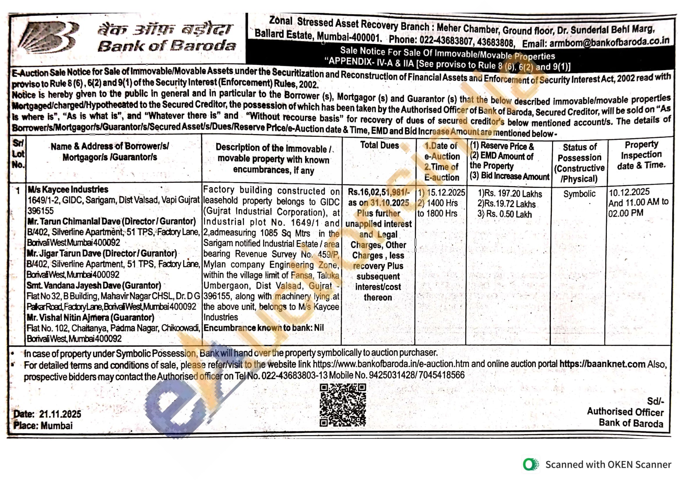 Factory building constructed on leasehold property belongs to GIDC (Gujrat Industrial Corporation), at Industrial plot No. 1649/1 and 2, admeasuring 1085 Sq Mtrs in the Sarigam notified Industrial Estate/area bearing Revenue Survey No. 459/P, Mylan company Engineering Zone, within the village limit of Fansa, Taluka Umbergaon, Dist Valsad, Gujrat -396155, along with machinery lying at the above unit, belongs to M/s Kaycee Industries Encumbrance known to bank: Nil