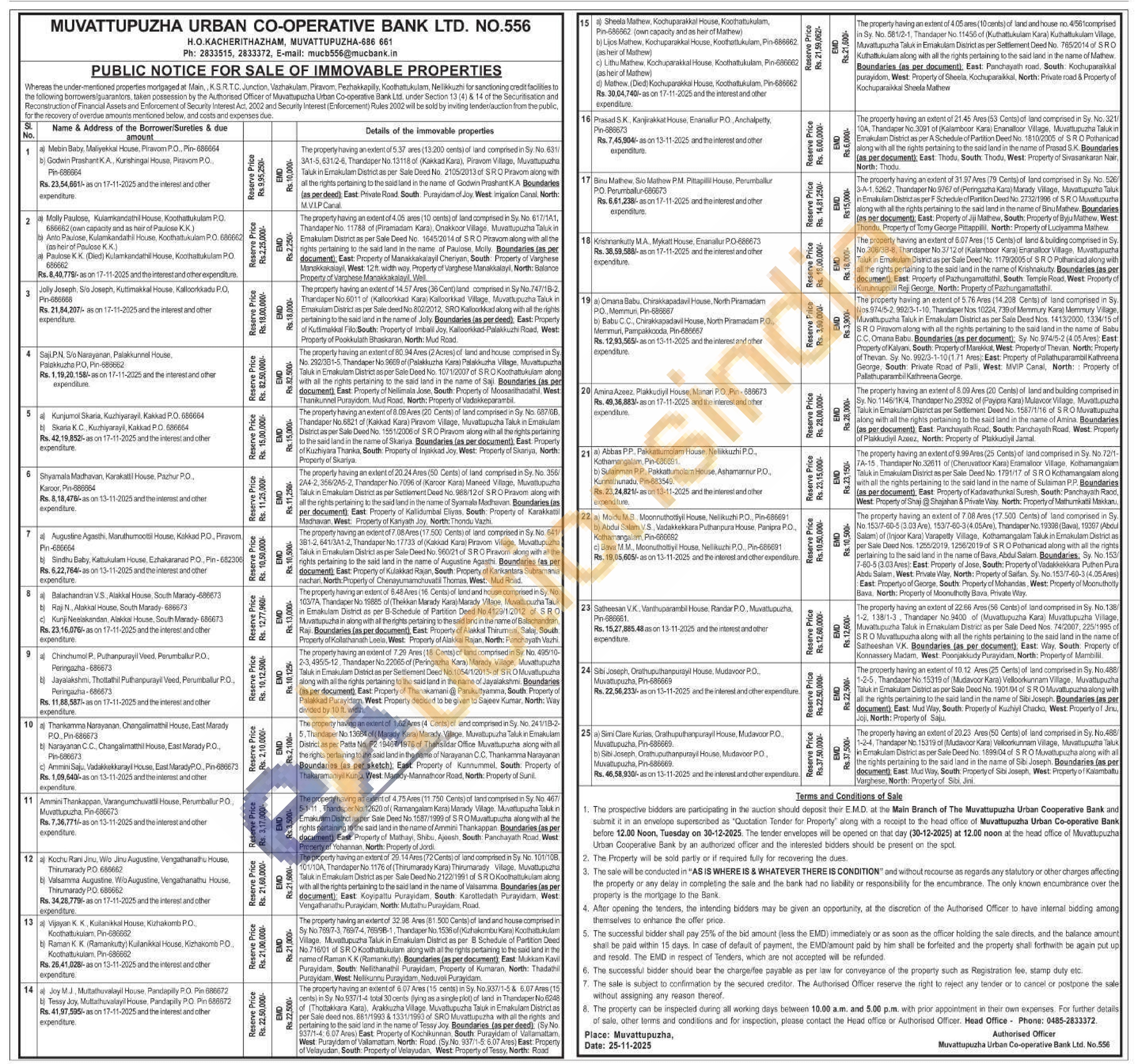 24) The property having an extent of 10.12 Ares (25 Cents) of land comprised in Sy, No.488/1-2-5, Thandaper No.15319 of (Mudavoor Kara) Velloorkunnam Village, Muvattupuzha Taluk in Emakulam District as per Sale Deed No. 1901/04 of SRO Muvattupuzha along with all the rights pertaining to the said land in the name of Sibi Joseph. Boundaries (as per document). East. Mud Way, South: Property of Kuzhiyil Chacko, West: Property of Jinu, Joji, North: Property of Saju.