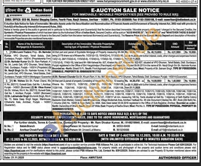 All that part & parcel of property Consisting of House Pvt. Plot No. 10 bearing 7/26/1/57, 7//28/1/17, 7/26/1/37, 7/26/1/47, 7/26/1/39, 7/26/1/40, 7/26/1/23, 7/26/1/1, 7/26/1/12, 71/26/1/13, 7/26/1/25, 7/126/1/26, 7/26/1/46, 71/26/1/34, 71/26/1/9, 7/26/1/10, 71/26/1/2/1, 7/26/1/6, 7/26/1/11, 7/26/1/14, 71/261/16, 7/26/1/19, 7/26/1/18, 7/26/1/8, 7/26/1/5, 71/26/1/4, 71/26/1/41, 7/26/1/42, 71/26/1/44, 71/26/1/45, 71/26/1/20, 7/26/1/30, 71/26/1/21, 7//26/1/7 all min, measuring 149 Sq. Yards situated at Gali No. 1 Adjoining of Seth Radha Colony Backside Grain Market, Outside Gate Bhagtanwala, Village Mullechak Area, Amritsar Hadbast No. 36 vide Document (Vasika) No. 967, Book (Zild Bahi) No. 1, Volume (Ziid) No. 15056 & Page (Safa) No. 9394. Sale Deed dated 30.04.2018 registered in the Office of Sub-Registrar, Amritsar. Bounded as under-North: Ownership of Others; South: Street 20' Wide; East: Property of Radhe Sham; West: Plot No. 9..