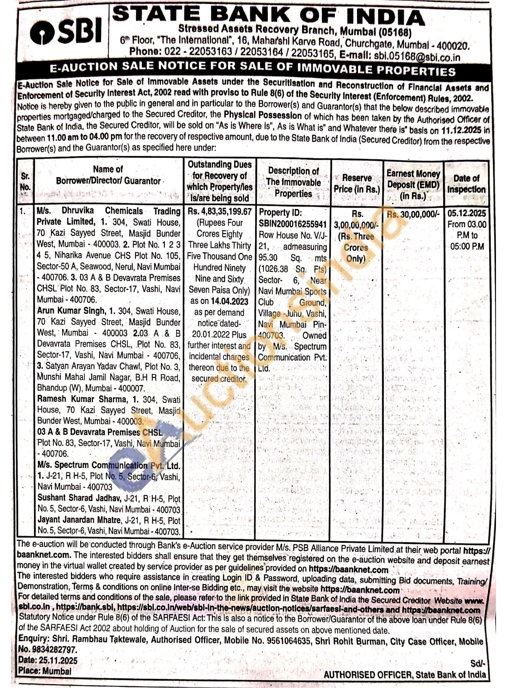 Row House No. V/J-21, admeasuring 95.30 Sq. mts (1026.38 Sq. Fts) Sector- 6, Near Navi Mumbai Sports Club Ground, Village -Juhu, Vashi, Navi Mumbai Pin-400703. Owned by M/s. Spectrum Communication Pvt. Ltd.