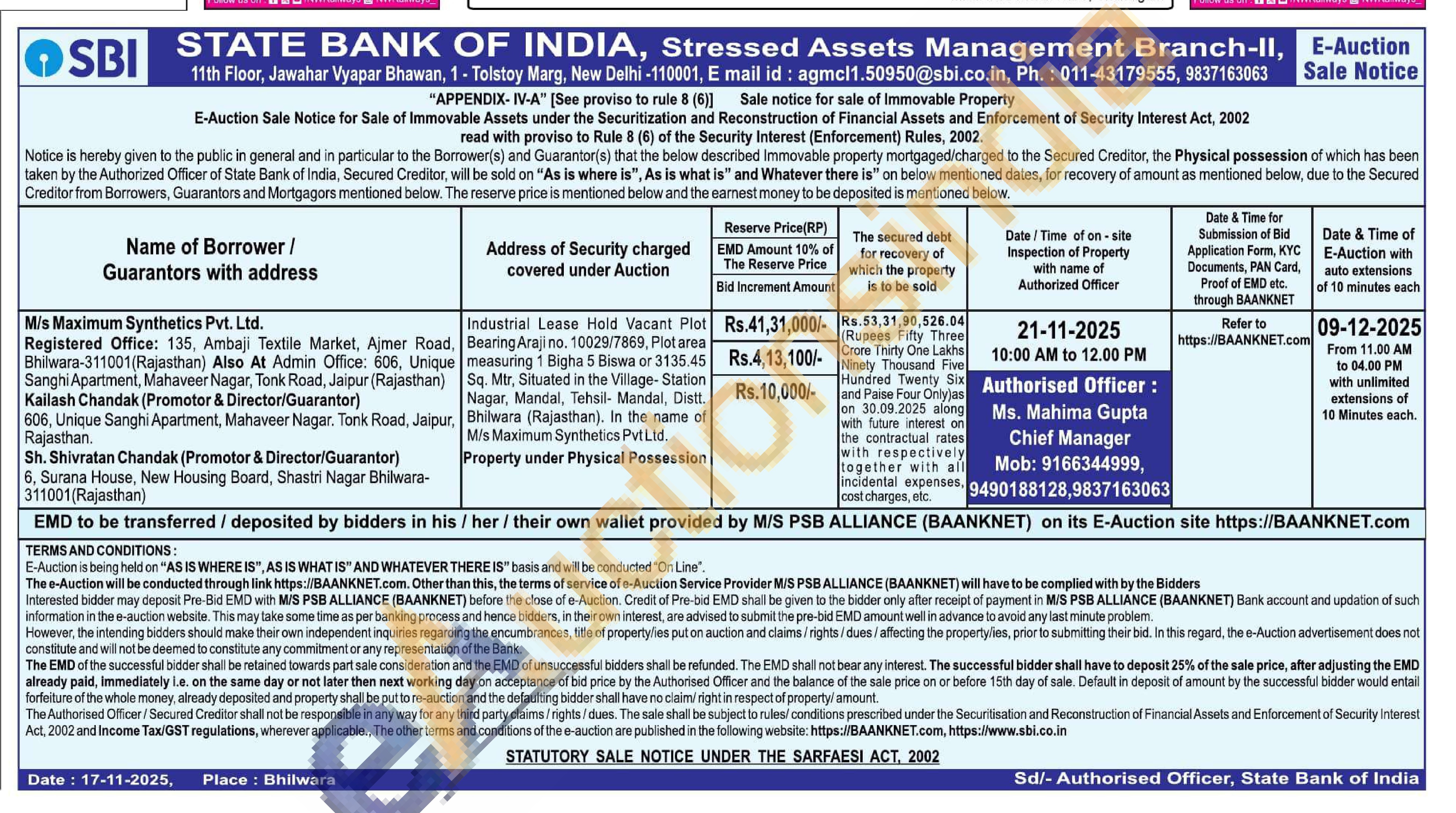 Industrial Lease Hold Vacant Plot Bearing Araji no. 10029/7869, Plot area measuring 1 Bigha 5 Biswa or 3135.45 Sq. Mtr, Situated in the Village-Station Nagar, Mandal, Tehsil- Mandal, Distt. Bhilwara (Rajasthan). In the name of M/s Maximum Synthetics Pvt Ltd.