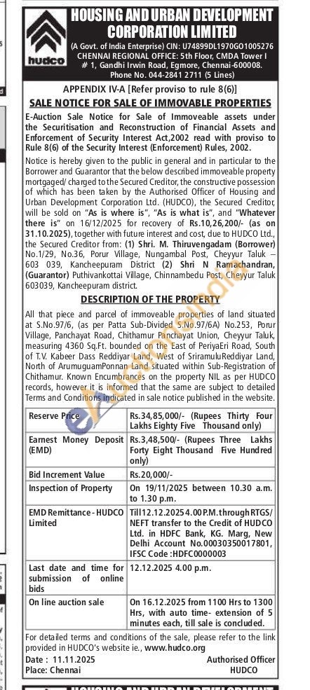 All that piece and parcel of immoveable properties of land situated at S.No.97/6, (as per Patta Sub-Divided S.No.97/6A) No.253, Porur Village, Panchayat Road, Chithamur Panchayat Union, Cheyyur Taluk, measuring 4360 Sq.Ft. bounded on the East of PeriyaEri Road, South of T.V. Kabeer Dass Reddiyar Land, West of Sriramulu Reddiyar Land, North of ArumuguamPonnan Land situated within Sub-Registration of Chithamur. Known Encumbrances on the property NIL as per HUDCO records, however it is informed that the same are subject to detailed Terms and Conditions indicated in sale notice published in the website.