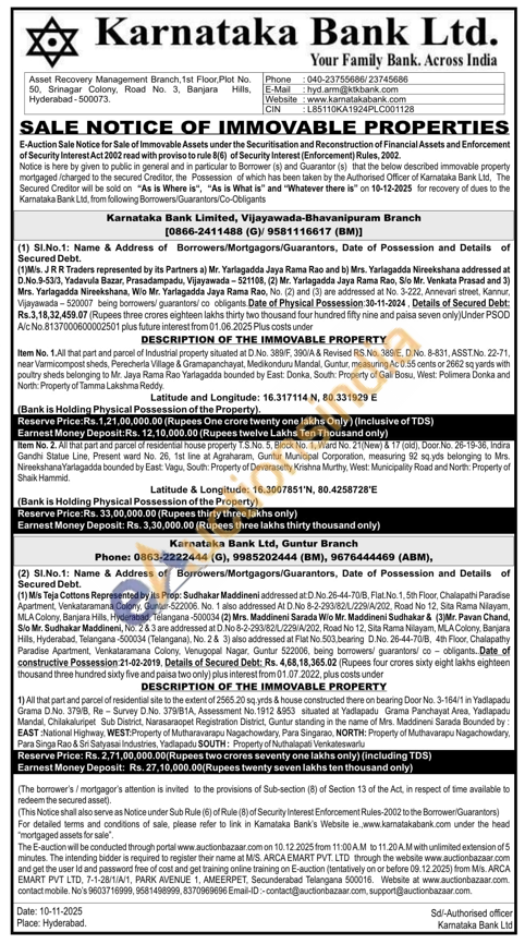 Item No. 1.All that part and parcel of Industrial property situated at D.No. 388/F, 390/A & Revised RS.No. 389/E, D.No. 8-831, ASST.No. 22-71, near Varmicompost sheds, Perecherla Village & Gramapanchayat, Medikonduru Mandal, Guntur, measuring Ac 0.55 cents or 2662 sq yards with poultry sheds belonging to Mr. Jaya Rama Rao Yarlagadda bounded by East: Donka, South: Property of Gali Bosu, West: Polimera Donka and North: Property of Tamma Lakshma Reddy