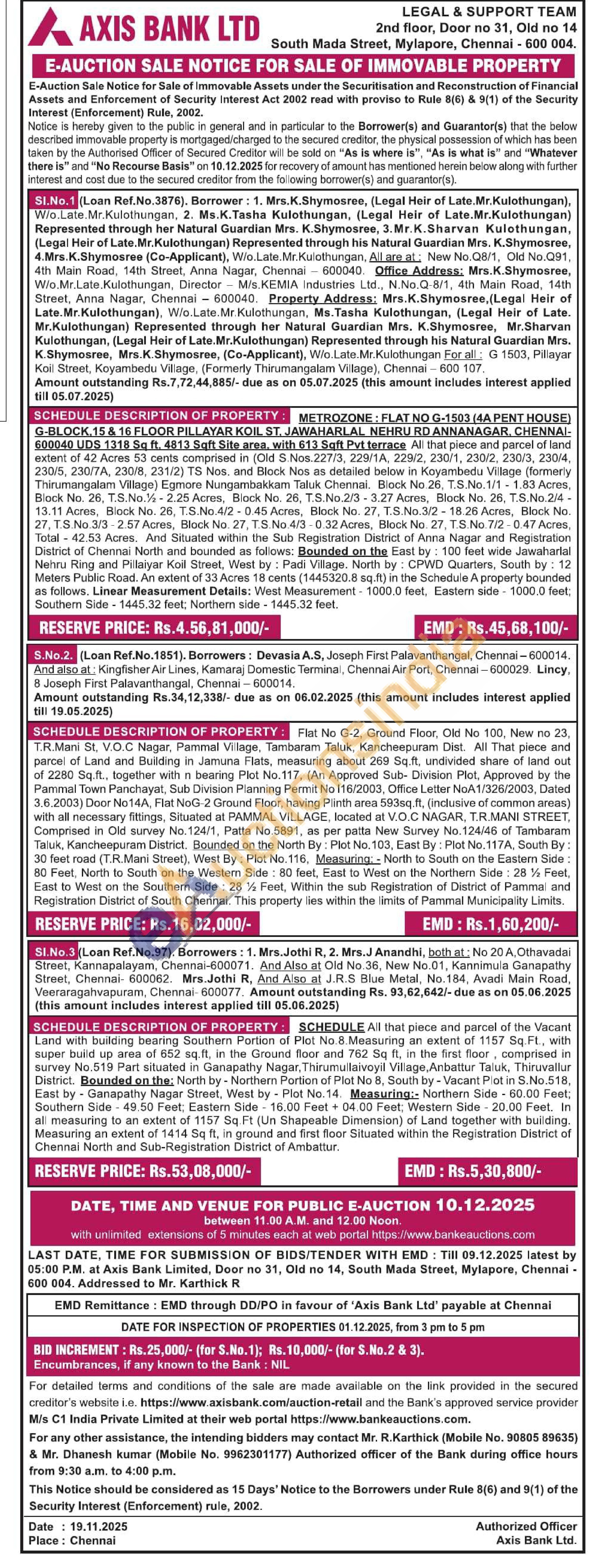 METROZONE: FLAT NO G-1503 (4A PENT HOUSE) G-BLOCK,15 & 16 FLOOR PILLAYAR KOIL ST. JAWAHARLAL NEHRU RD ANNANAGAR, CHENNAI-600040 UDS 1318 Sq ft. 4813 Sqft Site area, with 613 Sqft Pvt terrace All that piece and parcel of land extent of 42 Acres 53 cents comprised in (Old S. Nos.227/3, 229/1A, 229/2, 230/1, 230/2, 230/3, 230/4, 230/5, 230/7A, 230/8, 231/2) TS Nos. and Block Nos as detailed below in Koyambedu Village (formerly Thirumangalam Village) Egmore Nungambakkam Taluk Chennai, Block No 26, T.S.No.1/11.83 Acres, Block No. 26, T.S.No. 2.25 Acres, Block No. 26, T.S.No.2/3-3.27 Acres, Block No. 26, T.S.No. 2/4 -13.11 Acres, Block No. 26, T.S.No.4/20.45 Acres, Block No. 27, T.S.No.3/2-18.26 Acres, Block No. 27, T.S.No.3/3 2.57 Acres, Block No. 27, T.S.No.4/3 0.32 Acres, Block No. 27, T.S.No. 7/2-0.47 Acres, Total-42.53 Acres. And Situated within the Sub Registration District of Anna Nagar and Registration District of Chennai North and bounded as follows: Bounded on the East by: 100 feet wide Jawaharlal Nehru Ring and Pillaiyar Koil Street, West by: Padi Village. North by: CPWD Quarters, South by: 12 Meters Public Road. An extent of 33 Acres 18 cents (1445320.8 sq.ft) in the Schedule A property bounded as follows. Linear Measurement Details: West Measurement 1000.0 feet, Eastern side 1000.0 feet; Southern Side 1445.32 feet; Northern side-1445,32 feet.