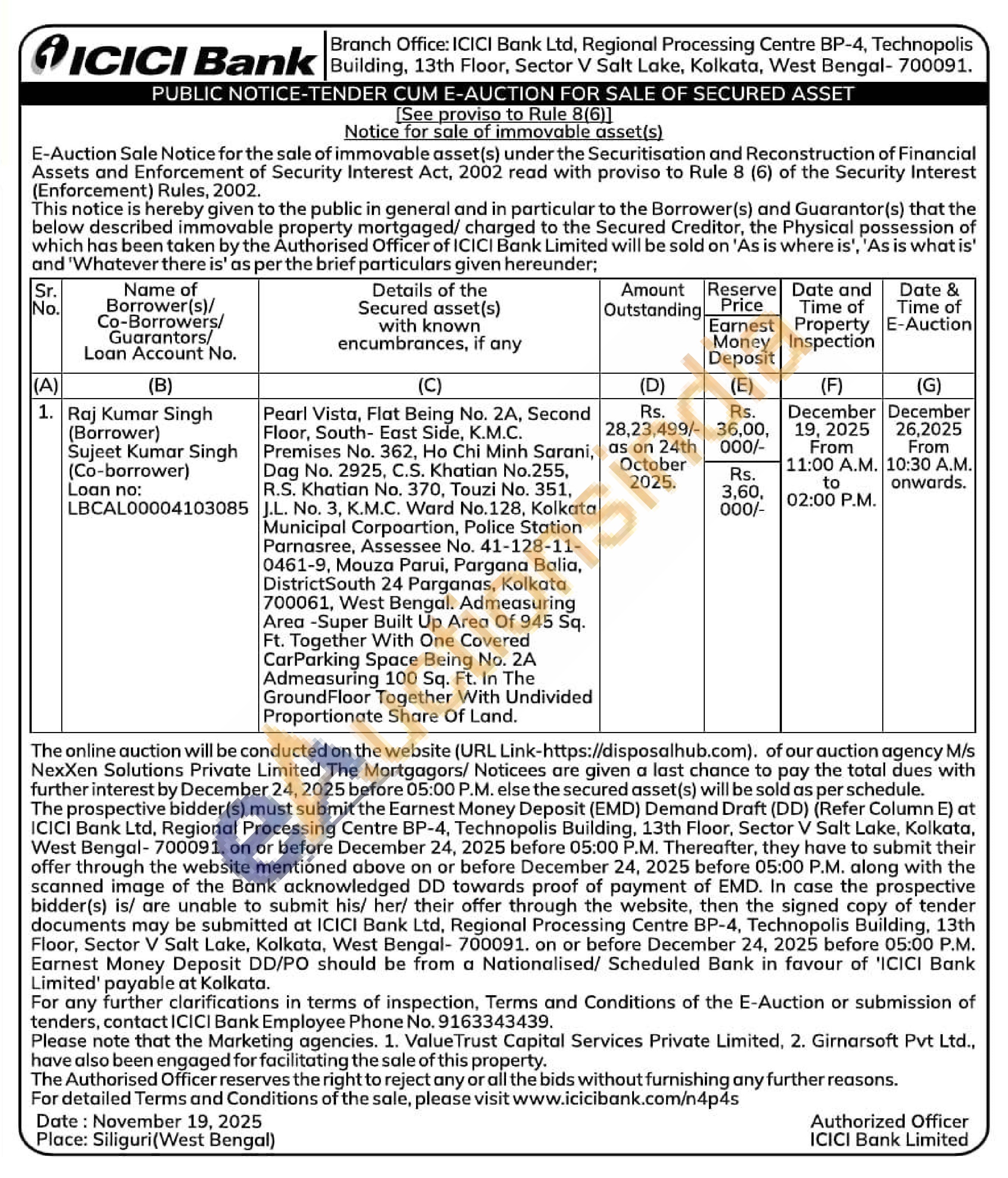 Pearl Vista, Flat Being No. 2A, Second Floor, South-East Side, K.М.С. Premises No. 362, Ho Chi Minh Sarani, Dag No. 2925, C.S. Khatian No.255, R.S. Khatian No. 370, Touzi No. 351, J.L. No. 3, K.M.C. Ward No.128, Kolkata Municipal Corpoartion, Police Station Parnasree, Assessee No. 41-128-11-0461-9, Mouza Parui, Pargana Balia, District South 24 Parganas, Kolkata 700061, West Bengal. Admeasuring Adm Area -Super Built Up Area Of 945 Sq. Ft. Together With One Covered CarParking Space Being No. 2A Admeasuring 100 Sq. Ft. In The Ground Floor Together With Undivided Proportionate Share Of Land.