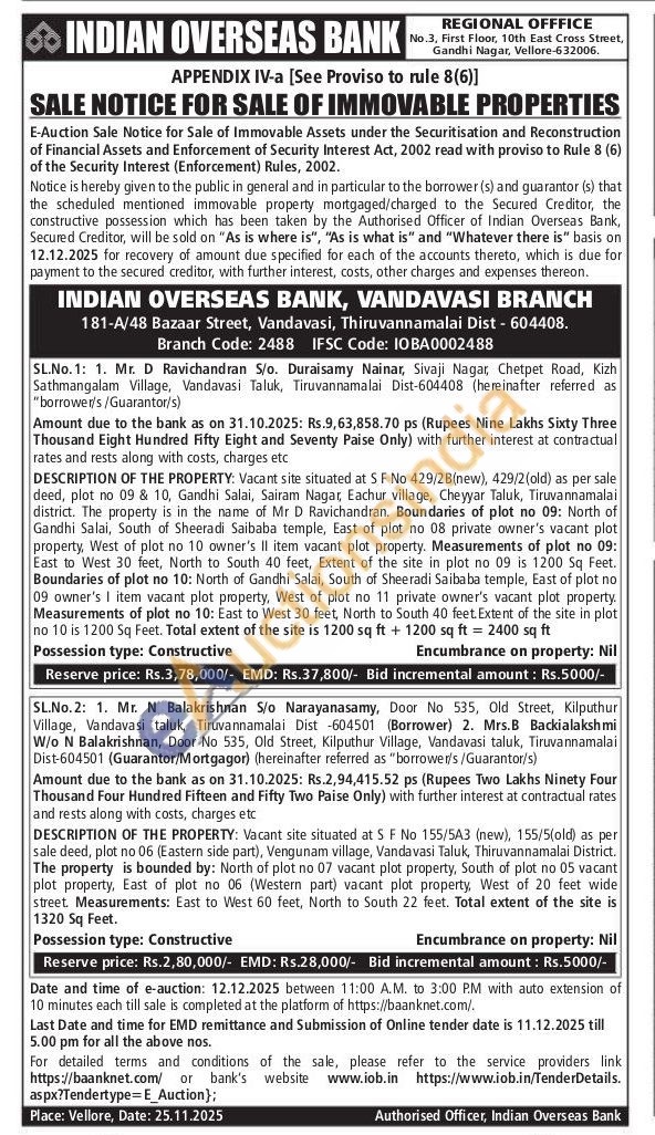 Vacant site situated at SF No 429/28(new), 429/2(old) as per sale deed, plot no 09 & 10, Gandhi Salai, Sairam Nagat, Eachur village, Cheyyar Taluk, Tiruvannamalai district. The property is in the name of Mr D Ravichandran. Boundaries of plot no 09: North of Gandhi Salai, South of Sheeradi Saibaba temple, East of plot no 08 private owner's vacant plot property, West of plot no 10 owner's II item vacant plot property. Measurements of plot no 09: East to West 30 feet, North to South 40 feet, Extent of the site in plot no 09 is 1200 Sq Feet. Boundaries of plot no 10: North of Gandhi Salai, South of Sheeradi Saibaba temple, East of plot no 09 owner's I item vacant plot property, West of plot no 11 private owner's vacant plot property. Measurements of plot no 10: East to West 30 feet, North to South 40 feet. Extent of the site in plot no 10 is 1200 Sq Feet. Total extent of the site is 1200 sq ft + 1200 sq ft = 2400 sq ft