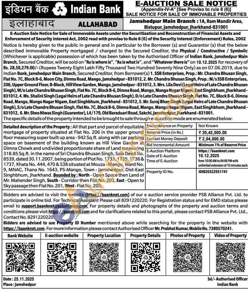 Detailed description of the Property: All that part and parcel of equitable mortgage of property situated at Flat No. 206 in the upper ground floor measuring super built up area - 942 Sq.ft. along with car parking space on basement of the building known as Hill View Garden at Dimna Chowk and undivided proportionate share of Land measuring 318.85 Sq.ft. in the name of Sri Chandra Bhusan Singh, Sale Deed No. 8539, dated 30.11.2007, being portion of Plot No. 1733, 1735, 1736& 1737, Khata No. 444, 470 & 538 situated at Mouza - Mango, Ward No. 9, MNAC, Thana No. 1643, PS-Mango, Town - Jamshedpur, Dist-East Singhbhum, Jharkhand. Bounded by: North - Open Space then Land of Mr. Mahender Singh, South - Corridor then Flat No. 203, East - Open to Sky passage then Flat No. 201, West-Flat No. 205