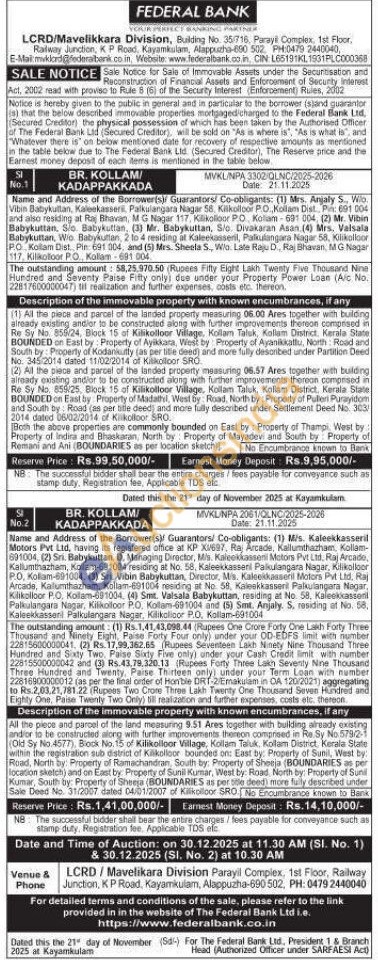 (2) All the piece and parcel of the landed property measuring 06.57 Ares together with building already existing andior to be constructed along with further improvements therean comprised in Re Sy No. 859/25, Block 15 of Kilikolloor Village, Kollam Taluk, Kollam District, Kerala State BOUNDED on East by Property of Madathel, West by: Road, North by: Property of Pulleri Purayidom and South by: Road (as per title deed) and more fully described under Settlement Deed No. 303 2014 dated 06/02/2014 of Kiikolloor SRO.