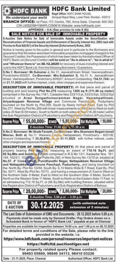 DESCRIPTION OF IMMOVABLE PROPERTY: All that piece and parcel of building and land bearing Plot No.270 measuring 1200 sq ft (111.48 sq meter) comprised in Re-Survey No. 118/1, Cadastre Nos 533/1/3 pt, 533/3/3/pt. 533/2/3/pt situated at Arasi Sengazhuneeramman Nagar, Veerampattinam, Ariyankuppam Revenue Village and Commune Parichayath, Puducherry bounded on the North by Plot-259, South by Newly formed Road, East by Plot No 271, West by Plot No.269 with linear measurements on the East to West on both sides-20 feet (6.09 meter) South to North on both sides-60 feet (18.26 meter) within the Sub-Registration District of Puducherry and Registration District of Puducherry