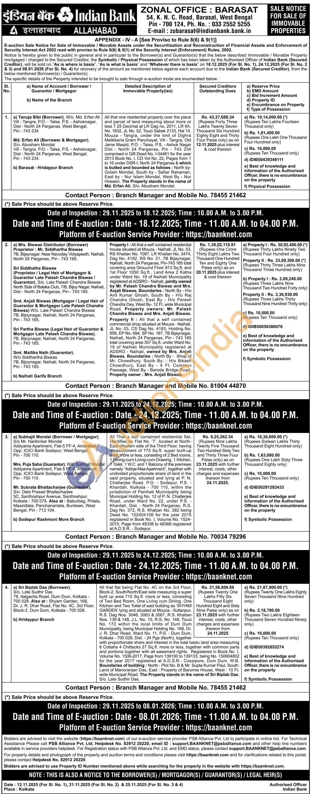 Property I: All that a self contained residential ADSRO - Naihati, owned by Mrs. Anjali Biswas. Boundaries: North By Shop of Mr. Chowdhury, South By: H/o Bikash Chowdhury, East By 4 Ft. Common Passage, West By Baroda Bridge Road. Property owner: Mrs. Anjali Biswas.house situated at Mouza - Naihati, JL No. 03, RS Khaitan No. 1087, LR Khaitan No. 3474, Dag No. 4192, RS No. 21, 7B Bijaynagar, Naihati, North 24 Parganas, Pin-743 165 total covering area Grouund Floor 913 Sq.ft. and 1st Floor 1050 Sq.ft., Land Area 2 Katha under Ward No. 19 of Naihati Municipality registered at ADSRO - Naihati, jointly owned by Mr. Palash Chandra Biswas and Mrs. Anjali Biswas. Boundaries: North By - H/o Anil Kumar Ghosh, South By H/o Raj Chandra Ghosh, East By H/o Paresh Chandra Dey, West By- 12 Ft. wide Municipal Road. Property owners: Mr. Palash Chandra Biswas and Mrs. Anjali Biswas. Property II
