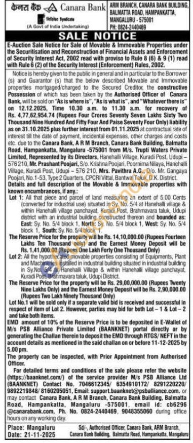 Lot 2: All the hypothecated movable properties consisting of Equipments, Plant and Machineries installed in industrial building situated in industrial building in Sy No. 5/4 at Hanehalli Village & within Hanehalli village panchayat, Kuradi Post. Brahmavara taluk, Udupi District
