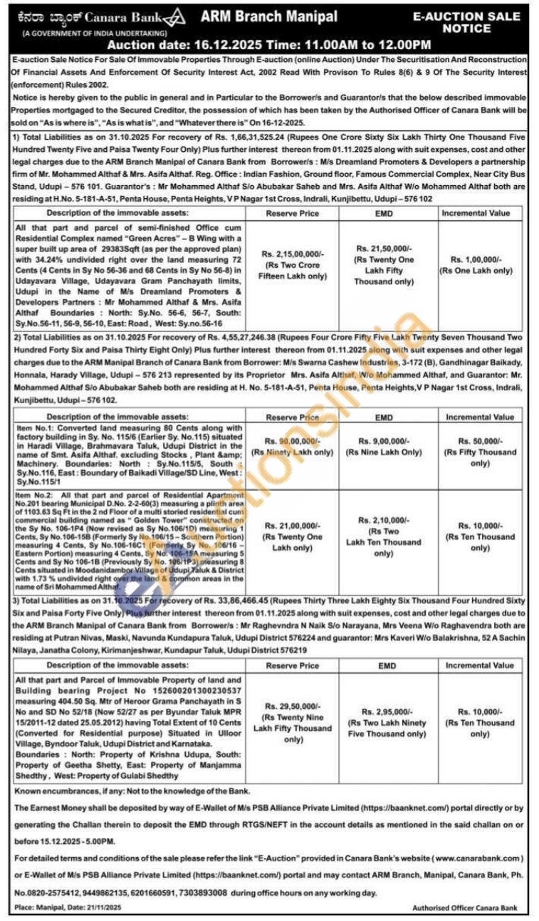 All that part and parcel of semi-finished Office cum Residential Complex named "Green Acres" - B Wing with a super built up area of 293835qft (as per the approved plan) with 34.24% undivided right over the land measuring 72 Cents (4 Cents in Sy No 56-36 and 68 Cents in Sy No 56-8) in Udayavara Village, Udayavara Gram Panchayath limits, Udupi in the Name of M/s Dreamland Promoters & Developers Partners: Mr Mohammed Althaf & Mrs. Asifa Althaf Boundaries: North: Sy.No. 56-6, 56-7, South: Sy.No.56-11, 56-9, 56-10, East: Road, West: Sy.no.56-16
