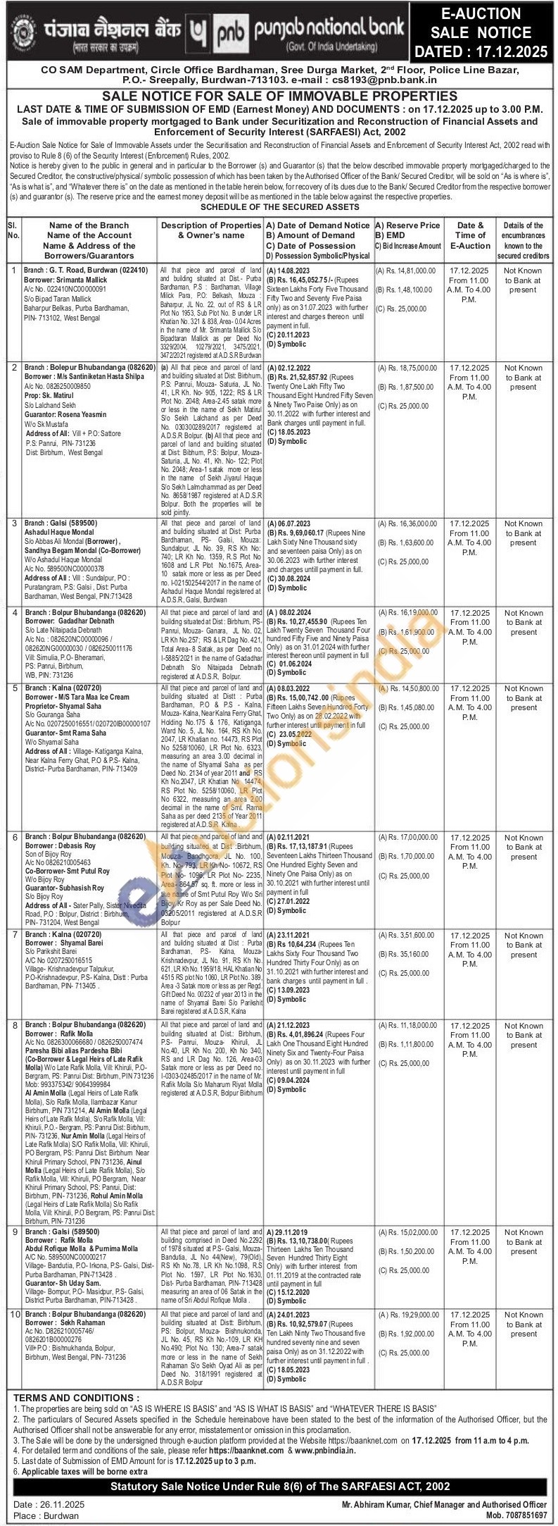 (a) All that piece and parcel of land and building situated at Dist: Birbhum, P.S: Panrui, Mouza- Saturia, JL No. 41, LR Kh. No- 905, 1222; RS & LR Plot No. 2048; Area-2.45 satak more or less in the name of Sekh Matirul Sio Sekh Lalchand as per Deed No. 030300289/2017 registered at A.D.S.R Bolpur. (b) All that piece and parcel of land and building situated at Dist: Bibhum, P.S: Bolpur, Mouza-Saturia, JL No. 41, Kh. No- 122; Plot No. 2048; Area-1 satak more or less in the name of Sekh Jiyarul Haque S/o Sekh Lalmohammad as per Deed No. 8658/1987 registered at A.D.S.R Bolpur. Both the properties will be sold jointly.