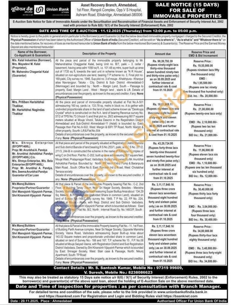 All the piece and parcel of the immovable property belonging to Mr. Mahendrabhai Chagganlal Kalal, being Unit no. B/7, paiki 3, cellar basement, having area adm 1090 sq ft, ie. 101.48 sq mtrs, super built up area out of 1735 sq ft, towards the said unit in scheme known as 'N R House", situated on non-agriculture use land, bearing TP scheme no. 3, Final plot no. 169 paiki, City survey no. 1946, Sup plot no. 3 of mouje-Khekhpura-Khanpur alias Navrangpur, Taluka City, District & Sub- District -Ahmedabad-3 (Memnagar) and bounded by North-Margin Land, South - Passage to property, East: Margin Land, West: Margin land, stairs & Lift. Details of encumbrances over the property, as known to the secured creditor, if any: None (Physical Possession)
