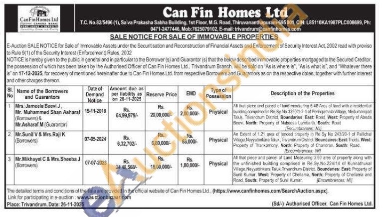 1)All that piece and parcel of land measuring 6.48 Ares of land with a residential curling comprised in Re Sy No.3390/1-2-1 of Peringamela Village. Nedumangad Take. Trivandrum District, Boundaries: East: Road, West: Property of Abeda Beev North: Property of Nabeesa Lanmbarth South: Road