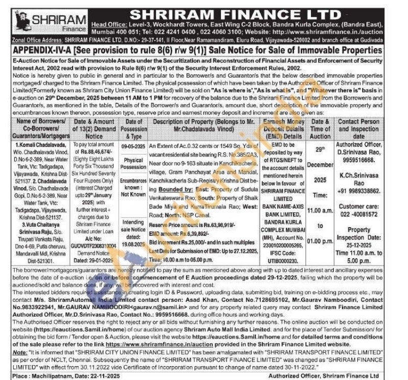 An Extent of Ac.0.32 cents or 1549 Sq. Yds of vacant residential site bearing R.S. No.385/243, Near door no 9-163 situate in Kanchikacherla, village, Gram Panchayat Area and Mandal, Kanchikacheria Sub-Registry Krishna Dist be-ing Bounded by: East: Property of Sudula Venkateswara Rao; South: Property of Shaik Bade Miya and Kurra Tirumala Rao; West: Road; North: NSP Canal