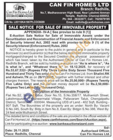 Flat No.S2, Second Floor, Door No.10, S.No.358/17, Muthamizh Street, Lakshmipuram, Thiruneermalai Village, Pallavaram Taluk, Chengalpattu District, Tamilnadu-600044. Measuring UDS of Land-402 Sqft, Building-907 Sqft. The Boundries of the property are as under: North By: Vacant S.No.345, South By: Bldg in Item No. 8. East By: Bldgin S.No.386, West By: 24 feet wide Muthamizh Street