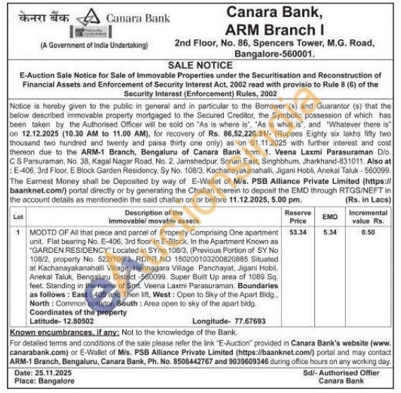 MODTD OF All that piece and parcel of Property Comprising One apartment unit. Flat bearing No. E-406, 3rd floor in E-Block, In the Apartment Known as "GARDEN RESIDENCY" Located in SYno 108/3, (Previous Portion of SY No 108/2, property No. 522/108/3, RDPR NO 150200103200820885 Situated at Kachanayakanahalli Village, Hennagara Village Panchayat, Jigani Hobli, Anekal Taluk, Bengaluru District -560099. Super Built Up area of 1089 Sq feet. Standing in the name of Smt. Veena Laxmi Parasuraman. Boundaries as follows: East: 405 and Then lift, West: Open to Sky of the Apart Bldg.. North: Common corridor, South Area open to sky of the apart bldg