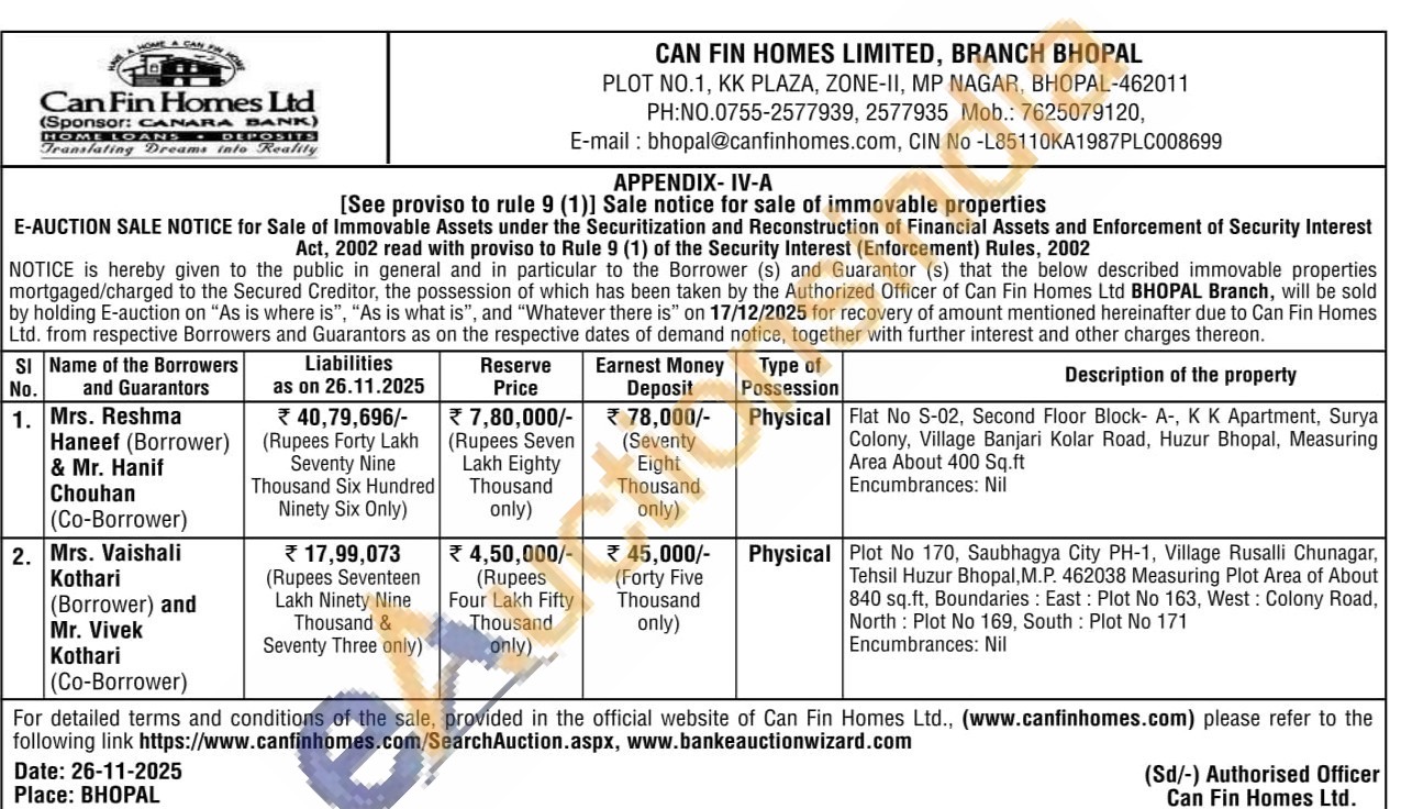 Flat No S-02, Second Floor Block- A-, K K Apartment, Surya Colony, Village Banjari Kolar Road, Huzur Bhopal, Measuring Area About 400 Sq.ft Encumbrances: Nil