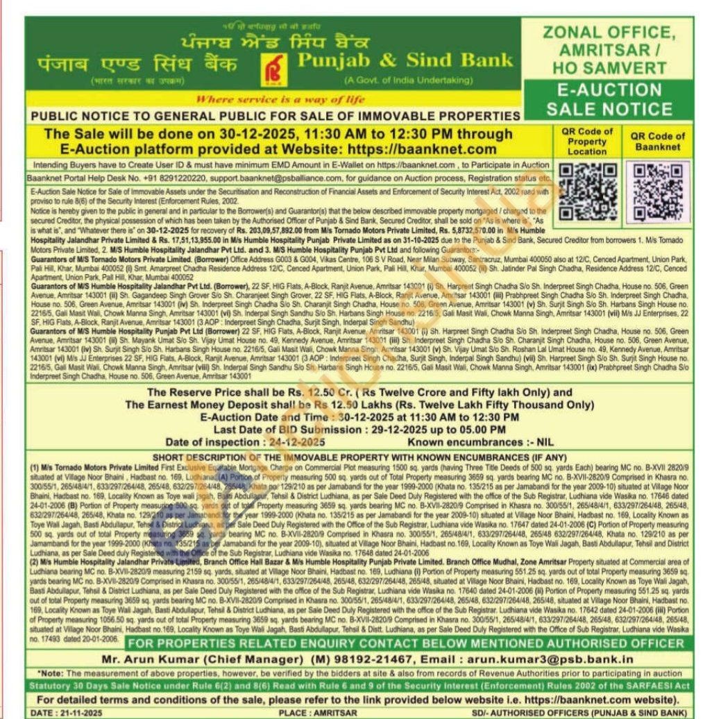 (2) Mis Humble Hospitality Jalandhar Private Limited, Branch Office Hall Bazar & Mis Humble Hospitality Punjab Private Limited. Branch Office Mudhal, Zone Amritsar Property situated at Commercial area of Ludhiana bearing MC no. B-XVII-28209 measuring 2159 sq, yards, situated at Village Noor Bhaini, Hadbast no. 169, Ludhiana (1) Portion of Property measuring 551.25 sq, yards out of total Property measuring 3659 sq. yards bearing MC no. B-XVII-2820/9 Comprised in Khasra no. 300/55/1, 265/48/4/1, 633/297/264/48, 265/48, 632/297/264/48, 265-48, situated at Village Noor Bhaini, Hadbast no. 169, Locality Known as Toye Wali Jagah, Basti Abdullapur, Tahsil & District Ludhiana, as per Sale Deed Duly Registered with the office of the Sub Registrar, Ludhiana vide Wasika no. 17640 dated 24-01-2006 (8) Portion of Property measuring 551.25 sq yards out of total Property measuring 3659 sq yards bearing MC no. B-XVII-2820/9 Comprised in Khasra no. 300/55/1, 265/46/4/1, 633/297/264/48, 265/48, 632/297/264/48, 265/48, situated at Village Noor Bhaini, Hadbast no 169, Locality Known as Toye Wall Jagah, Basti Abdullapur, Tehsil & District Ludhiana, as per Sale Deed Duly Registered with the office of the Sub Registrar. Ludhiana vide Wasika no. 17642 dated 24-01-2006 (iii) Portion of Property measuring 1056.50 sq, yards out of total Property measuring 3659 sq yards bearing MC no. B-XVII-2820/9 Comprised in Khasra no. 300/55/1, 265/48/4/1, 633/297/264/48, 265/48, 632/297/264/48, 265/48, situated at Village Noor Bhaini, Hadbast no. 169, Locality Known as Toye Wali Jagah, Basti Abdulapur, Tehsil & Distt. Ludhiana, as per Sale Deed Duly Registered with the Office of Sub Registrar, Ludhiana vide Wasika no. 17493 dated 20-01-2006