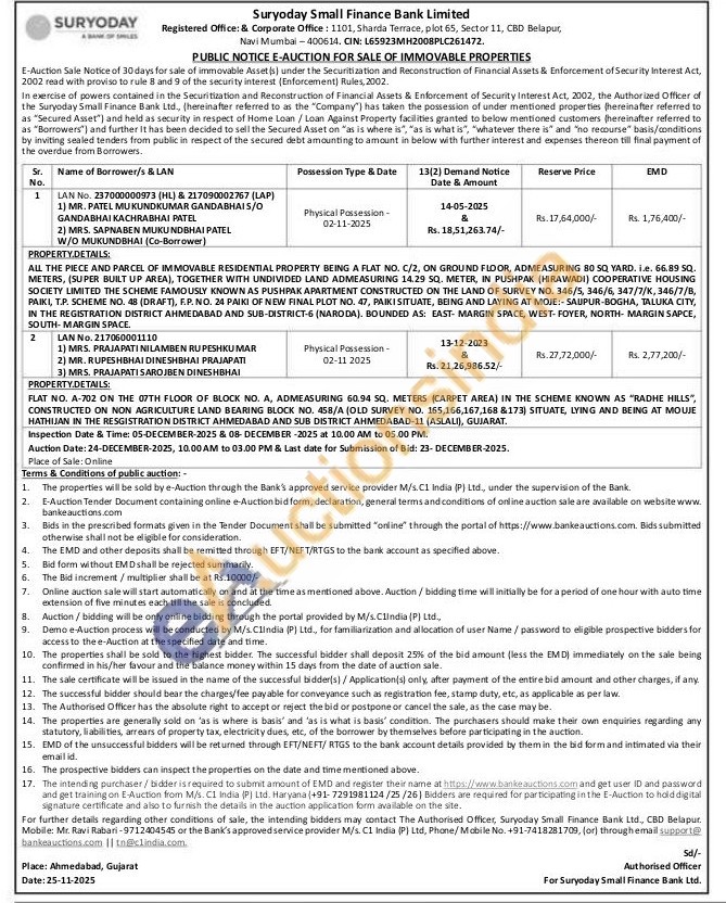 ALL THE PIECE AND PARCEL OF IMMOVABLE RESIDENTIAL PROPERTY BEING A FLAT NO. C/2, ON GROUND FLOOR, ADMEASURING 80 SQ YARD. i.e. 66.89 SQ. METERS, (SUPER BUILT UP AREA), TOGETHER WITH UNDIVIDED LAND ADMEASURING 14.29 SQ. METER, IN PUSHPAK (HIRAWADI) COOPERATIVE HOUSING SOCIETY LIMITED THE SCHEME FAMOUSLY KNOWN AS PUSHPAK APARTMENT CONSTRUCTED ON THE LAND OF SURVEY NO. 346/5, 346/6, 347/7/Κ, 346/7/8, PAIKI, T.P. SCHEME NO. 48 (DRAFT), F.P. NO. 24 PAIKI OF NEW FINAL PLOT NO. 47, PAIKI SITUATE, BEING AND LAYING AT MOJE:- SAUPUR-BOGHA, TALUKA CITY, IN THE REGISTRATION DISTRICT AHMEDABAD AND SUB-DISTRICT-6 (NARODA). BOUNDED AS: EAST- MARGIN SPACE, WEST-FOYER, NORTH-MARGIN SAPCE,