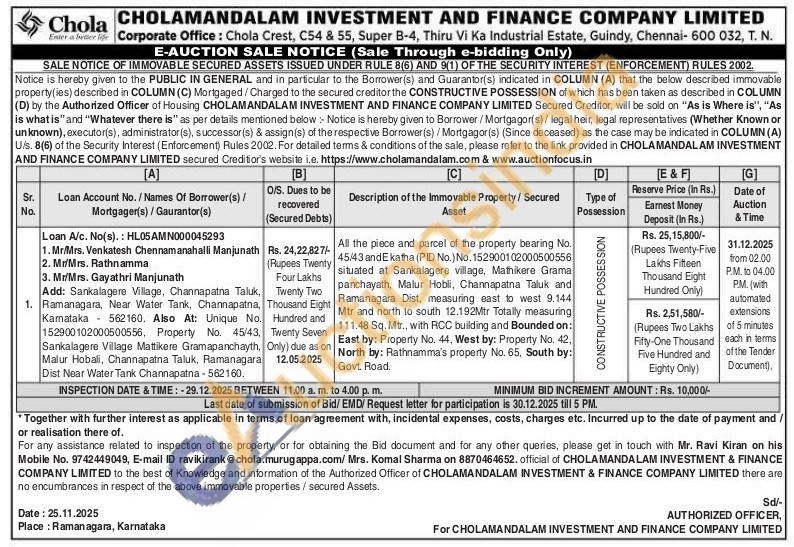 All the piece and parcel of the property bearing No. 45/43 and E katha (PID No.) No. 152900102000500556 situated at Sankalagere village, Mathikere Grama panchayath, Malur Hobli, Channapatna Taluk and Ramanagara Dist, measuring east to west 9,144 Mtr and north to south 12.192Mtr Totally measuring 111.48 Sq. Mtr., with RCC building and Bounded on: East by: Property No. 44, West by: Property No. 42, North by: Rathnamma's property No. 65, South by: Govt. Road