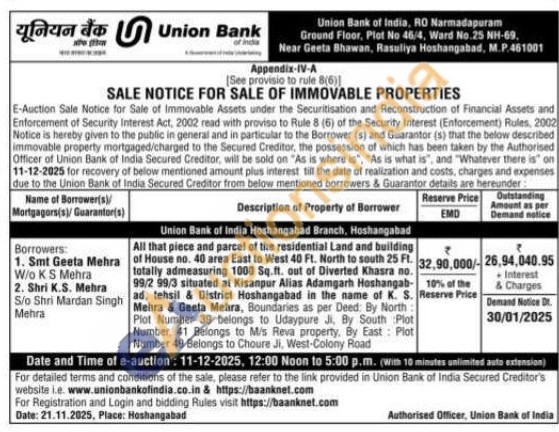 All that piece and parcel of the residential Land and building of House no. 40 area East to West 40 Ft. North to south 25 Ft. totally admeasuring 1000 Sq.ft. out of Diverted Khasra no. 99/2 99/3 situated at Kisanpur Alias Adamgarh Hoshangab-ad, tehsil & District Hoshangabad in the name of K. S. Mehra & Geeta Mehra, Boundaries as per Deed: By North: Plot Number 39 belongs to Udaypure Ji, By South Plot Number, 41 Belongs to M's Reva property, By East: Plot Number 49 Belongs to Choure Ji, West-Colony Road