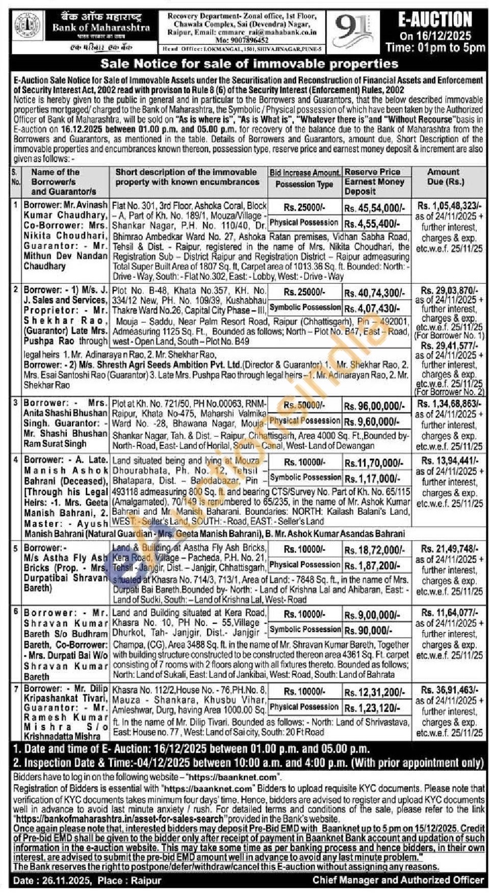 Plot No. B-48, Khata No.357, KH. No 334/12 New, PH. No. 109/39, Kushabhau Thakre Ward No.26, Capital City Phase-III Mouja Saddu, Near Palm Resort Road, Raipur (Chhattisgarh), Pin-492001, Admeasuring 1125 Sq. Ft., Bounded as follows; North-Plot No. B47, East-Road, west-Open Land, South-Plot No. B49