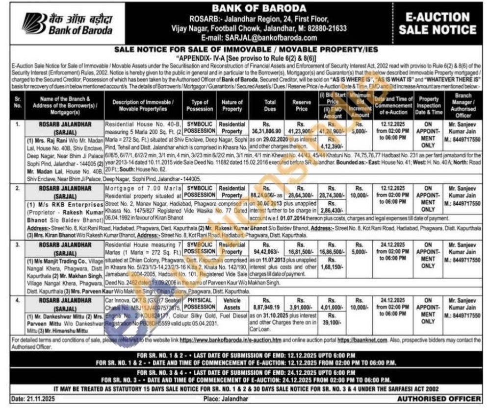 Residential House measuring 7 Marias (1 Maria 272 Sq. Ft)situated at Dhian Colony, Phagwara, Distt. Kapurthala comprised in Khasra No. 5/23/1/3-14,23/2/3-16 Kitta 2, Khata No. 142/190 Jamabandi 2004-2005, Hadbast No. 101, Registered Vide Sale Deed No. 2462 dated 19.09.2006 in the name of Parveen Kaur Wio Makhan Singh
