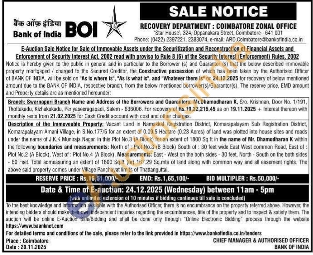 Description of the Immoveable Property: Vacant Land in Namakkal Registration District, Komarapalayam Sub Registration District, Komarapalayam Amani Village, in S.No.177/5 for an extent of 0.09.5 Hectare (0.23 Acres) of land was plotted into house sites and roads under the name of J.K.K Muniraja Nagar, in this Plot No.3 (A Block) for an extent of 1800 Sq.ft in the name of Mr. Dhamodharan K within the following boundaries and measurements: North of Plot No.3 (B Block) South of: 30 feet wide East West common Road, East of: Plot No.2 (A Block), West of: Plot No.4 (A Block), Measurements: East-West on the both sides - 30 feet, North-South on the both sides 60 Feet. Total admeasuring an extent of 1800 Sq.ft (or) 167.29 Sq.mts of land along with common way and all easement rights. The above said property comes under Village Panchayat limits of Thattanguttai