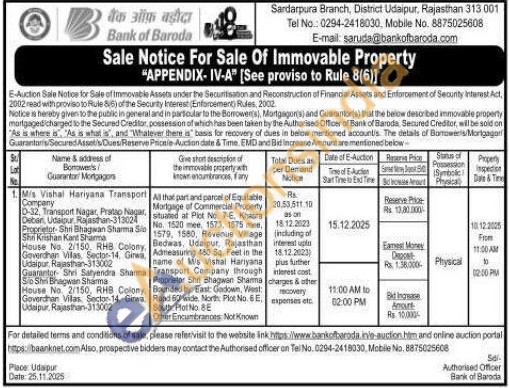 Al that part and parcel of Equitable Mortgage of Commercial Property situated at Pict No. 7-6 Khasra No. 1520 mee 1573 1575 mm 1579, 1580, Revenue Village Bedwas, Udaipur, Rajasthan Admeasuring 480 Sq. Feel in the name of M/s Vishal Hariyana Transport Company through Proprietor Shri Bhagwan Shanna Bounded by: East: Gedown, West Road 60 wide. North Plot No. 6E South: Plot No. 8E