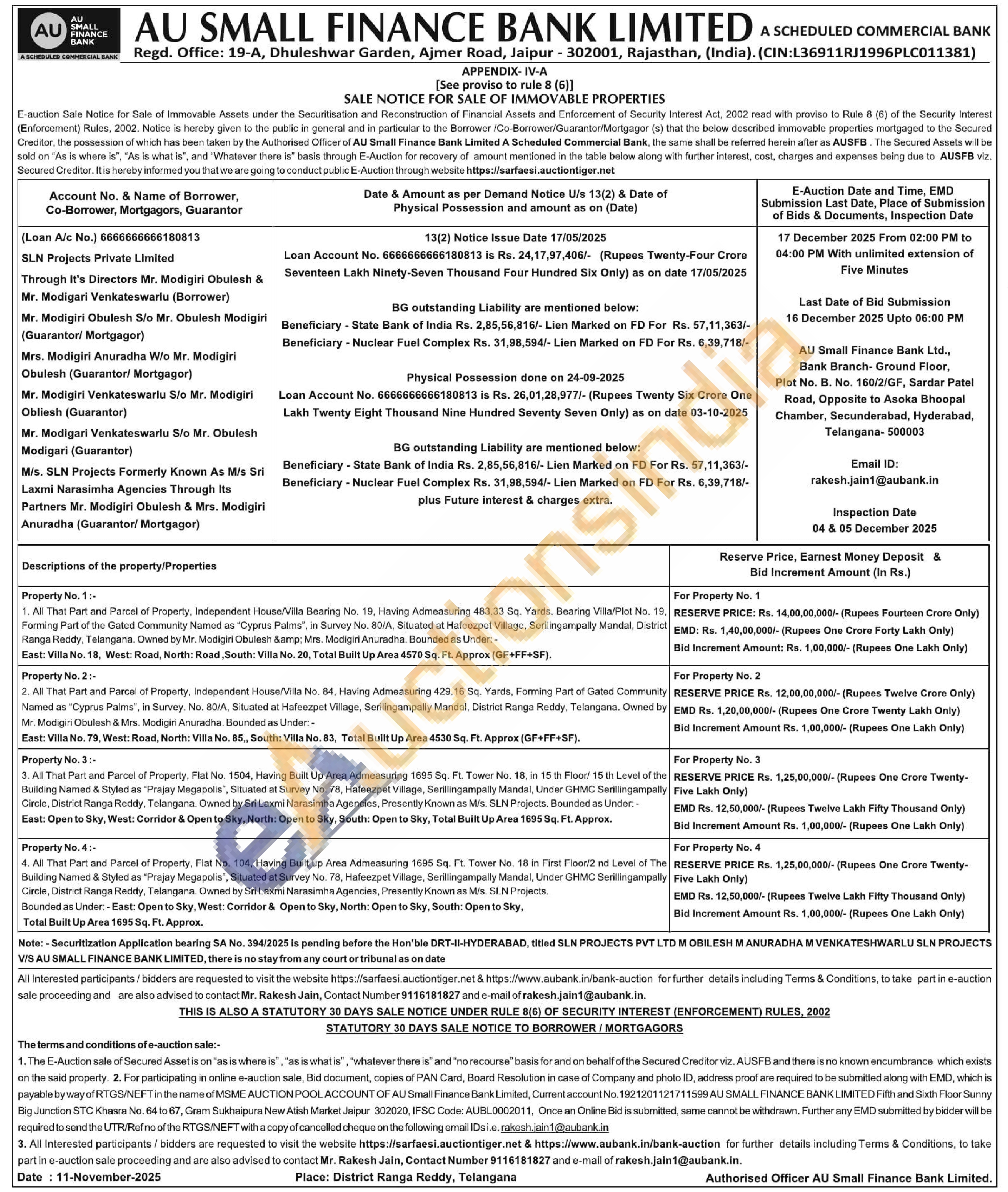 All That Part and Parcel of Property, Independent House/Villa Bearing No. 19, Having Admeasuring 483.33 Sq. Yands. Bearing Villa/Plot No. 19, Forming Part of the Gated Community Named as "Cyprus Palms", in Survey No. 80/A, Situated at Hafeezpet Village. Serlingampally Mendel, District Ranga Reddy, Telangana. Owned by Mr. Modigiri Obulesh & Mrs. Modigirl Anuracha Bounded as Under