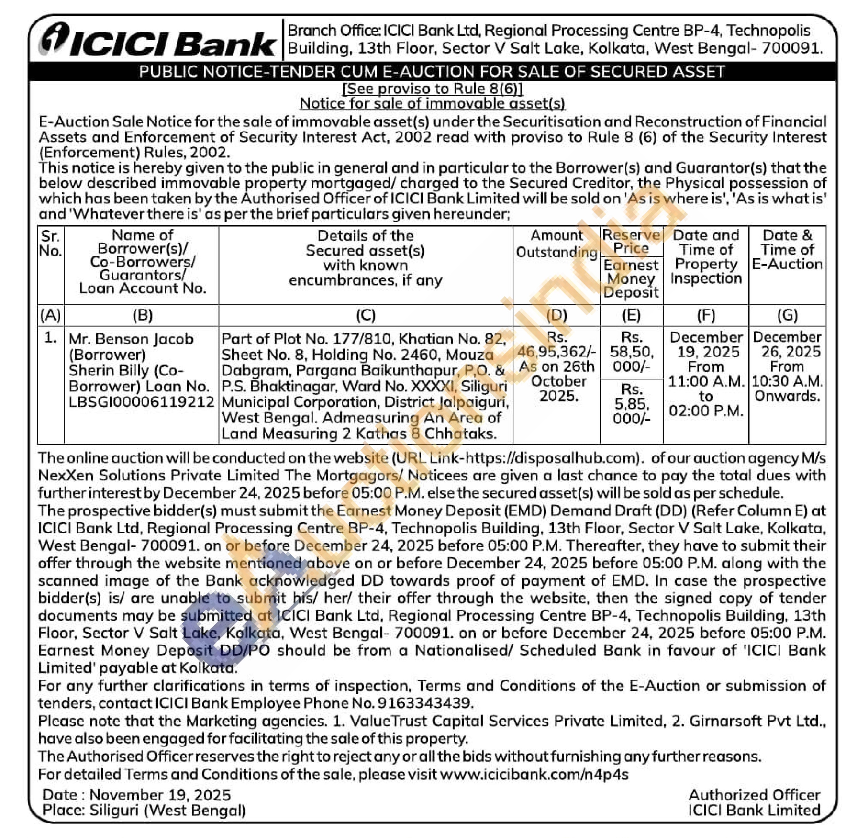 Part of Plot No. 177/810, Khatian No. 82, Sheet No. 8, Holding No. 2460, Mouza Dabgram, Pargana Baikunthapur, P,O. & West Bengal. Admeasuring An Area of Land Measuring 2 Kathas 8 Chhataks. P.S. Bhaktinagar, Ward No. XXXXI, Siliguri Municipal Corporation, District Jalpaiguri,
