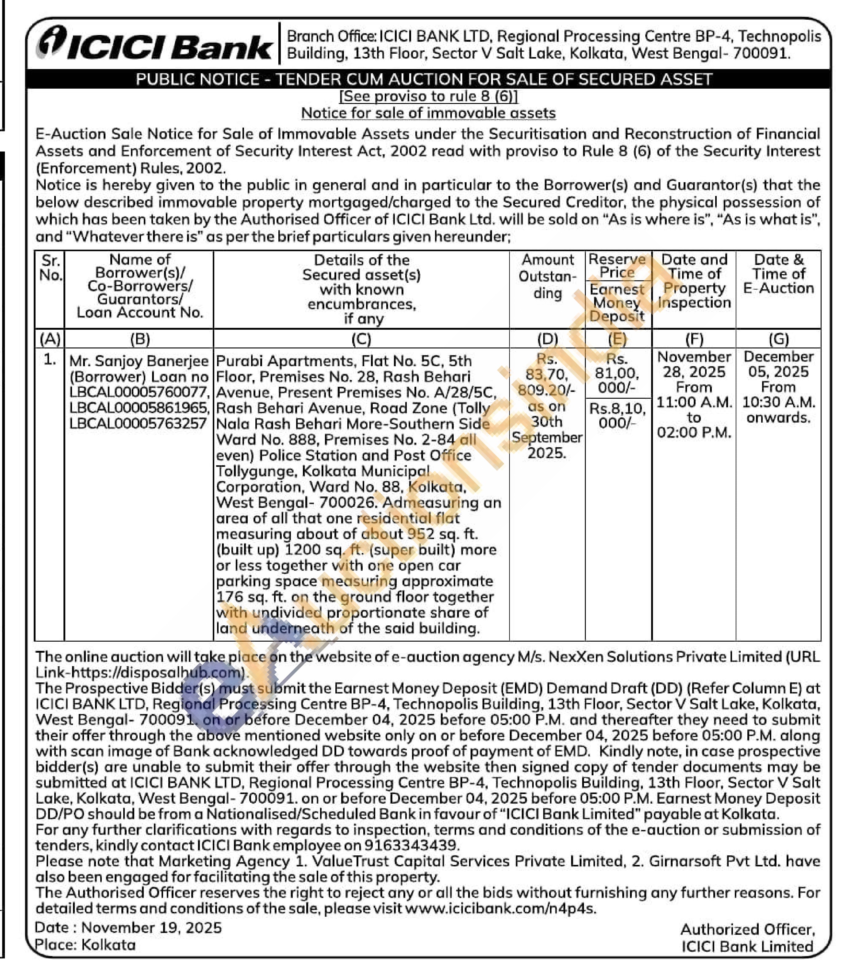 Purabi Apartments, Flat No. 5C, 5th Floor, Premises No. 28, Rash Behari Avenue, Present Premises No. A/28/5C, , Rash Behari Avenue, Road Zone (Tolly Nala Rash Behari More-Southern Side Ward No. 888, Premises No. 2-84 all even) Police Station and Post Office Tollygunge, Kolkata Municipal Corporation, Ward No. 88, Kolkata, West Bengal-700026. Admeasuring an area of all that one residential flat measuring about of about 952 sq. ft. (built up) 1200 sq. ft. (super built) more or less together with one open car parking space measuring approximate 176 sq. ft. on the ground floor together with undivided proportionate share of land underneath of the said building.