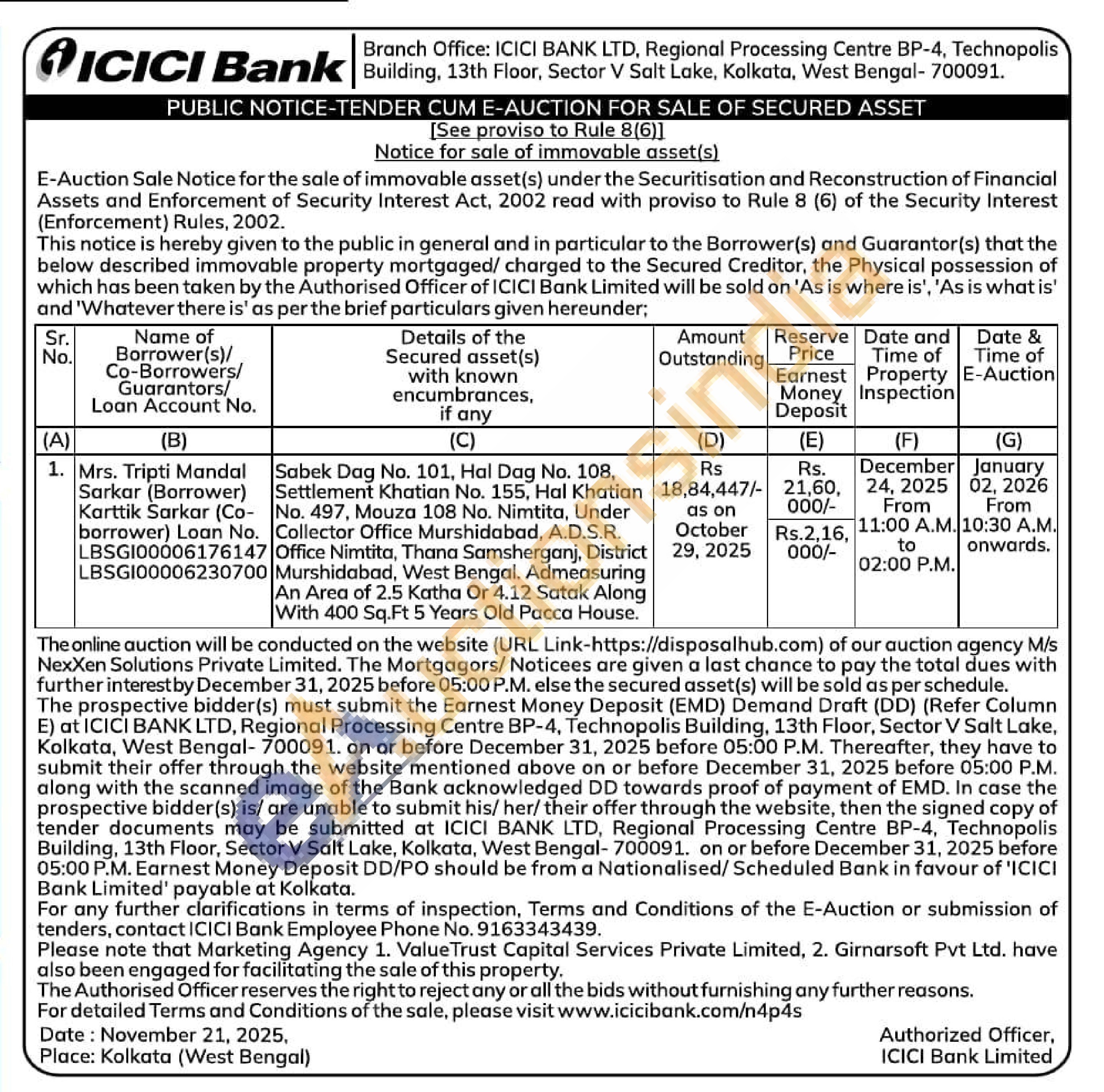 Sabek Dag No. 101, Hal Dag No. 108, Settlement Khatian No. 155, Hal Khatian No. 497, Mouza 108 No. Nimtita, Under Collector Office Murshidabad, A.D.S.R. Office Nimtita, Thana Samsherganj, District Murshidabad, West Bengal. Admeasuring An Area of 2.5 Katha Or 4.12 Satak Along With 400 Sq.Ft 5 Years Old Pacca House.