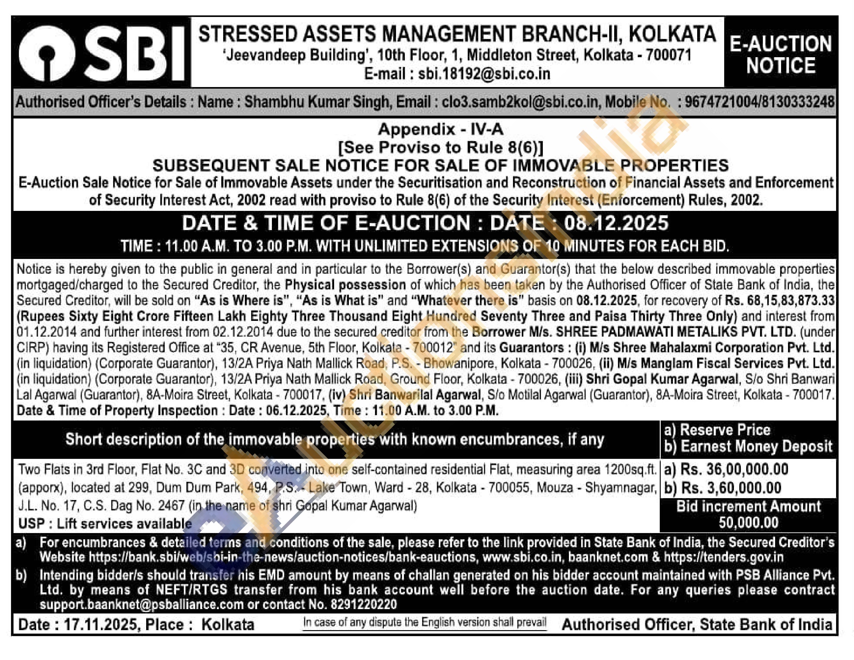Two Flats in 3rd Floor, Flat No. 3C and 3D converted into one self-contained residential Flat, measuring area 1200sq.ft. (apporx), located at 299, Dum Dum Park, 494, P.S. Lake Town, Ward - 28, Kolkata - 700055, Mouza - Shyamnagar, J.L. No. 17, C.S. Dag No. 2467 (in the name of shri Gopal Kumar Agarwal)