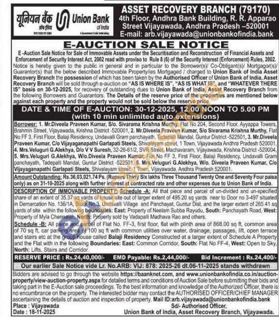 All that piece and parcel of un-divided and un-specified share of an extent of 35.37 sq yards of house site out of larger extent of 495.20 sq yards near to Door no 3-497 situated in Demarcation No. 136/1A, Block No.3, Undavalli Village and Panchayat, Guntur Dist, and the larger extent of 265.41 sq yards of site within the following boundaries: East: Property of Neelam Subba Rayudu, South: Panchayath Road, West: Property of Myla Chennaiah, North: Property sold by Vadapalli Madhava Rao and others. Schedule -B: All piece and parcel of Flat No. FF-3, first floor, flat with plinth area of 868.00 sq ft, common area of 70 sq ft, car parking area of 100 sq ft with common utilities over water, drainage, passages, lift, open terrace and stairs etc at the group house called Balaji Residency Constructed at a larger extent of Schedule A Property and the Flat with in the following Boundaries: East: Common Corridor, South: Flat No FF-4, West: Open to Sky, North: Lifts, Stairs and Corridor