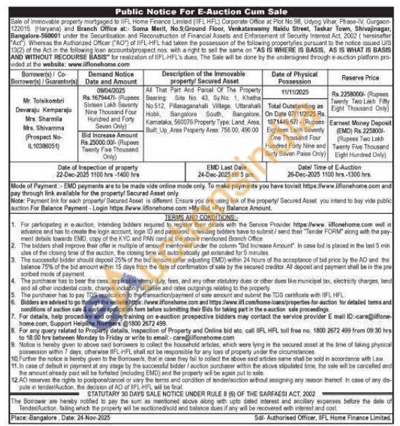 All That Part And Parcel Of The Property Bearing Side No. 43, Sy No 1, Khatha No 512, Pilanaganahali Village, Uttarahali Habli, Bangalore South, Bangalore, Kamataka, 560076 Property Type: Land Area. Bull Up Area Property Area: 756.00, 490.00