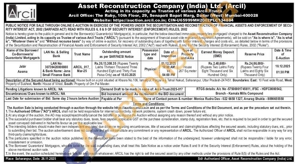 House built on a plot situated at Khasra No.106, Ismailpur, Pargana & Tehsil Nakud, Saharanpur, Uttar Pradesh-247451. Boundaries: East: 10 Feet wide Road, West: Property of Susheel, North: House of Vinod, South: Property of Om Pal Master.