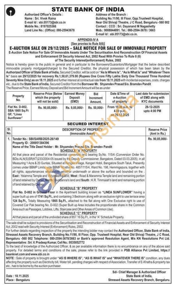 SCHEDULE "A" PROPERTY All that piece and parcel of the Residential converted land bearing Sy.No. 115/4 (Conversion Order No. BDis:ALN(S)SR(KT)233/2004-05 issued by the Deputy Commissioner, Bangalore, Dated 03.03.2005), in all Measuring 1 Acre & 20 Guntas, Situated at Kengeri Village, Kengeri Hobli, Bangalore South Taluk, Presently comes under BBMP Limits, vide BBMP Khatha No. 4857/115/4, Ward No. 198, Hemmigepura, together with all rights, appurtenances whatsoever, whether underneath or above the surface and bounded on the East: Yelamma Temple and Vidyapeetha land, West: Road & Maramma Temple land and remaining portion of land retained by Owner, North: Buddanna's land and South: K.R. Timmaiah's land and remaining portion of land retained by Owner.SCHEDULE "B" PROPERTY Flat No. D-002 in Ground Floor in the Apartment building known as "LINEA SUNFLOWER" having a super built up are of 1741 Sq.Ft., and containing 3 Bedroom along with an exclusive right to use terrace area 124 Sq.Ft., Totally Measuring 1865 Sq.Ft., attached to the flat along with One Exclusive right to use of Covered Car Pak bearing No. D-002 (Super Built up Area includes the proportionate share in the Common Area such as Passages, Lobbies, Lifts, Staircase and Other Areas of Common Use). SCHEDULE "C" PROPERTY All that piece and parcel of the undivided share of 857.16 Sq.Ft., in the "A" Schedule Property